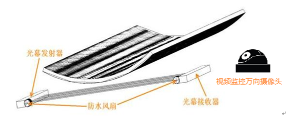 檢測原理圖如下圖1所示,通過在皮帶機(jī)下方,安裝光柵監(jiān)測裝置,當(dāng)皮帶撕裂時(shí),隨著皮帶的運(yùn)轉(zhuǎn),皮帶上的物料將掉落,并截?cái)喙鈻虐l(fā)送裝置的發(fā)射端和接收端之間的光軸,接收端通過數(shù)字量的形式傳送給中央處理單元,中央處理單元根據(jù)光軸截?cái)嗟那闆r,實(shí)時(shí)分析并判斷皮帶是否存在撕裂情況,同時(shí)可視系統(tǒng)啟動(dòng),對現(xiàn)場畫面進(jìn)行可視觀察,并通過無線通信接口,傳送到通信網(wǎng)關(guān),網(wǎng)關(guān)通過企業(yè)內(nèi)部以太網(wǎng)絡(luò)傳回到監(jiān)控中心。