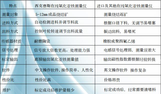 近年來,燒結礦質量對改善高爐操作和獲得優質鐵水變得更為重要,高爐燒結礦比也穩定提高。由于燒結礦中FeO含量穩定與否不僅影響燒結礦的機械強度、低溫還原粉化指標和廠內返礦率,而且影響高爐利用系數、熱平衡、燃料比和鐵水質量等指 標的穩定性,因而燒結礦中FeO含量是評價燒結礦質量的主要指 標之一。所以,許多燒結廠都非常注意研究燒結產品中FeO含量 的穩定性。 在線式燒結礦氧化亞鐵檢測儀適合于煉鐵鐵前燒結機后燒結礦的 氧化亞鐵含量監測和相應過程控制 在線式氧化亞鐵測量儀是北京西克賽斯科技有限公司針對燒 結工藝研發的燒結礦FeO含量實時、連續、在線監測設備。該設備 設計、技術、性能、質量均屬世界一流水平。整體設備可靠性高、使用壽命長、測量精確,并且具有在線校準和參數修正功能。 參與系統控制應用顯著效果: (1)燒結礦FeO含量更穩定,波動大為減少; (2)燒結礦FeO含量達到目標值的比例大為增加; (3)鐵水硅含量的穩定性提高; (4)與常規批量取樣和試驗室分析結果相比,該系統連續測量 燒結礦FeO含量結果要快3.5h,能有效地節省人力。